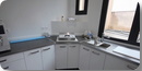 Une zone laboratoire équipée permet de maintenir les instruments propres , secs , emballés ou mis en containers étanches puis stérilisés par autoclavage.